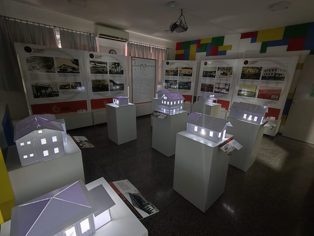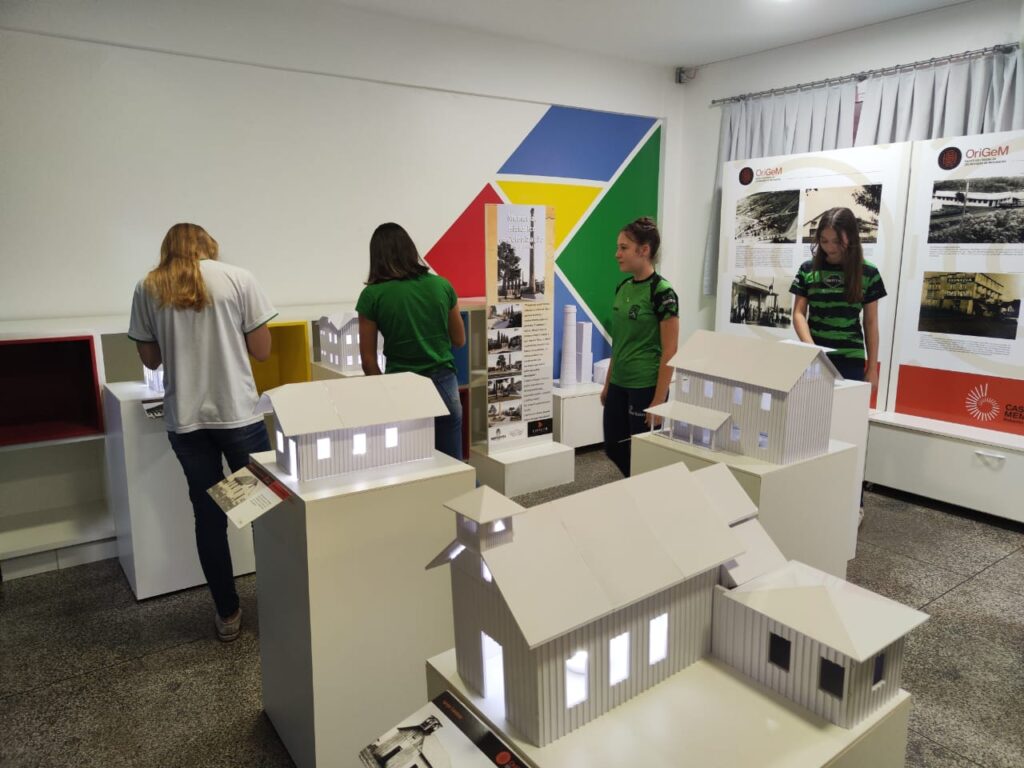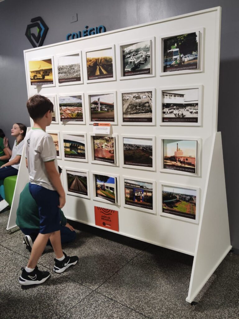 Após os pronunciamentos, foi realizado o desate da fita e os presentes puderam visitar a exposição, que traz o início da colonização até o final da década de 1960, uma viagem no tempo, em que as histórias e memórias de Medianeira são contadas e recordadas, através de fotos, documentos e depoimentos. “Trouxemos para o Colégio Bertoni o 1° Perímetro Urbano de Medianeira, em forma de um mapa, que mostra a cidade já está planejada com base no ‘X’, com as Avenidas Pedro Soccol e José Callegari ‘cortando’ a cidade. De forma interativa, pode-se ter acesso a fotos e informações sobre estabelecimentos, prédios públicos e locais como eram na época, dispostos em tótens informativos. Apresentamos também nove maquetes físicas, com algumas edificações das primeiras décadas, reproduzidas em impressora 3D, em parceria com a Secretaria Municipal de Educação e a UTFPR – Campus Medianeira. Também um Jogo da Memória Gigante, em que de forma lúdica e interativa, pode-se exercitar a memória e conhecer a História do município. São 10 locais, com imagens das décadas de 1950 e 1960, combinadas com imagens da atualidade. Ou seja, 20 imagens que marcam a História de Medianeira”, detalha a coordenadora de Gestão Documental e Memória da Casa da Memória Roberto Antonio Marin, Ana Cláudia Valério.